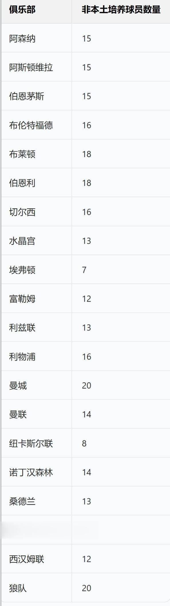 目前英超各俱乐部的非本土培养球员数量(部分俱乐部仍需在今夏进行调整):