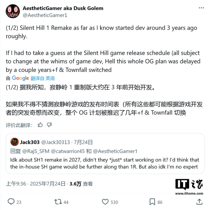 IT之家7月26日消息,消息源DuskGolem昨日(7月25日)在X平台发布推文,表示科乐美(Konami)开发《寂静岭1》(SilentHill1)重制版游戏至少已3年时间,并预估将在2027年发行。