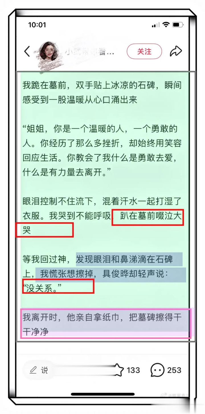 据大S粉丝讲述她在墓碑上哭的梨花带雨,不小心弄湿了大S的墓碑,她擦完以后离开的时候好看具俊晔把墓碑擦的干干净净!