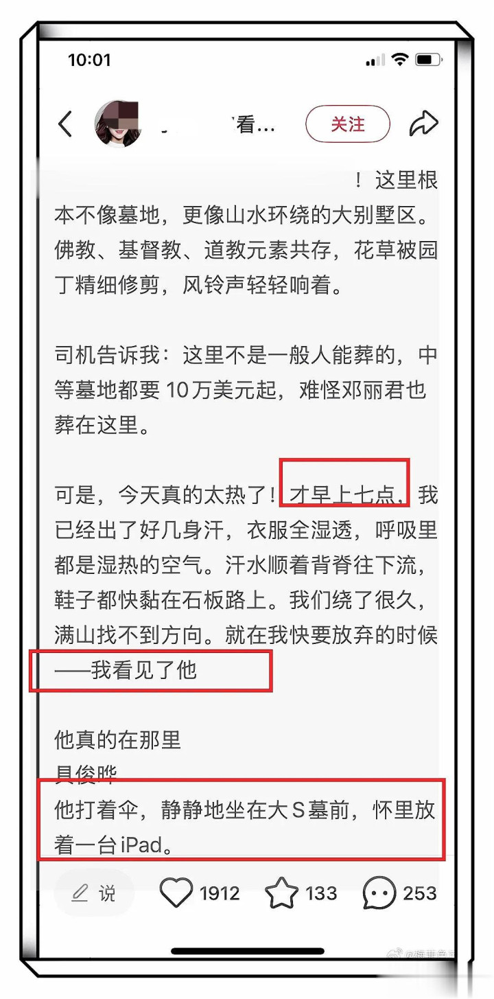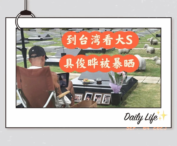 大S粉丝在网上发文,她从洛杉矶回台北看望大S,7点左右到达墓地的时候看到了具俊晔坐在大S墓地前,旁边放着好几个相框,上面是具俊晔跟大S的合影。照片上的大S看起来很幸福。具俊晔给大S带了三明治和咖啡!看着具俊晔坐在小椅子上的背影不免让人一阵心酸,想爱的人阴阳相隔,让人痛心!