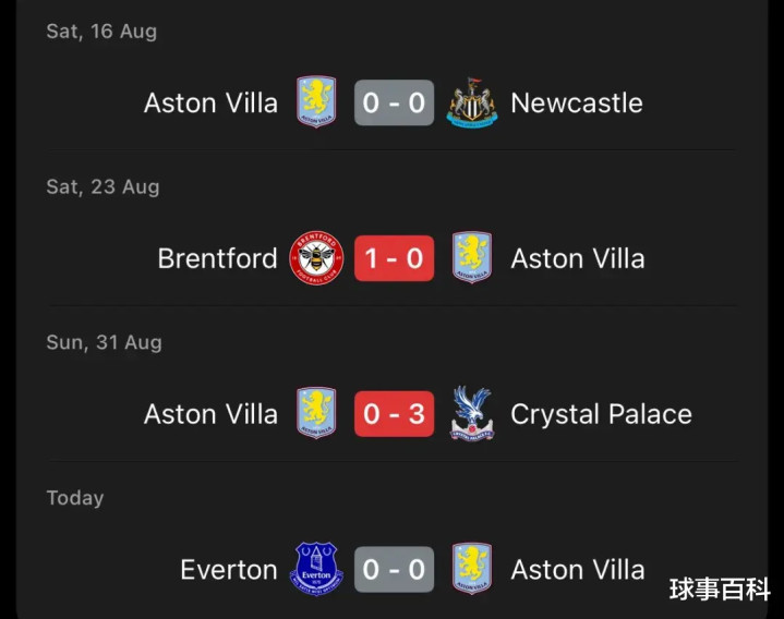 据统计,维拉是英格兰92家职业俱乐部中唯一一支至今仍未进球的球队。4轮英超比赛过后,维拉只拿到2场平局,积2分排名英超倒数第二。这也是维拉自1997-98赛季以来的最差开局。他们也成为了英超历史上第五支开局四轮不进球的球队,之前四支分别是谢菲尔德星期三(1993-94)、纽卡斯尔联(2005-06)、斯旺西城(2011-12)和水晶宫(2017-18)。