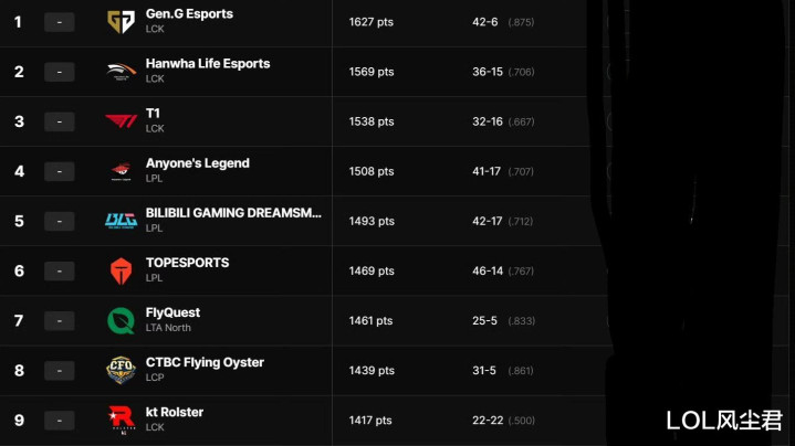 拳头官方在近日,更新了全球队伍战力榜单,LCK的GEN、HLE、T1包揽前三,LPL的AL、BLG、TES分别位列4-6名,剩下的7-10名,分别是FLY、CFO、KT、G2,咱赛区的四号种子IG,连前10都没挤进去,不过这个榜单,看一乐就行了,因为拳头是按胜场、败场数自动计算的。