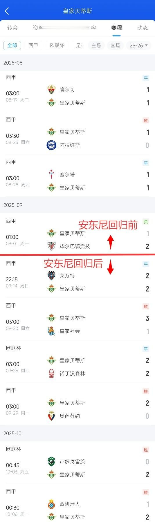 在安东尼回归贝蒂斯之前,贝蒂斯赛季前4场比赛仅获得1场胜利!甚至季前赛的4场里都1胜1平2负举步维艰。安东尼的回归对贝蒂斯战绩的影响显而易见。