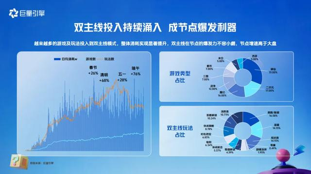 但要说这些副玩法的具体效果如何,可能巨量引擎的感知才更加清晰:除了提升整体收入之外,投入双主线的产品,往往能在一些重要节点实现爆发性的增长,超过大盘的增速。
