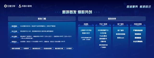 像是不久前,巨量引擎就曾联合抖音小游戏推出激励政策:在抖音首发的小游戏新品,首发大推14天内达到门槛,即可获得诸如上线90天收益全返还、平台出资补贴、投广返利之类的扶持,以及包含驻场支持、火山引擎减免,甚至VIP客服的一系列特别待遇。