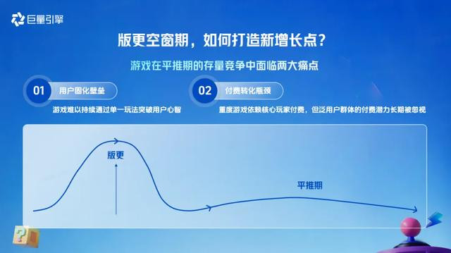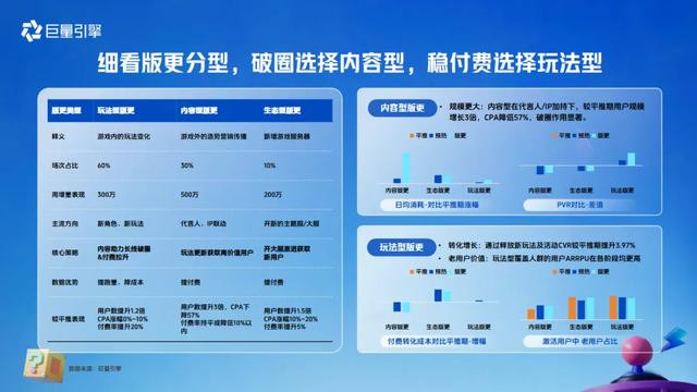 比如在当下,行业最公认的版本规律,就是尽可能地延长长线运营周期,做长青游戏。但光这么说,只能算一个抽象目标。所以巨量引擎抓住了一个具体的点展开研究——版更。