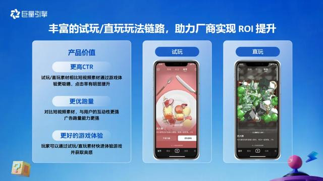 比如APP+小游戏的试玩、小游戏的直玩功能,都是比较创新的平台能力。它可以让你在看到游戏后,在没有任何跳转和登录,也不用选服、创角的前提下所见即所得地开玩。这种沉浸式前置体验,不管在跑量能力、效果,还是玩家体验、想象空间上,都有不小的价值。