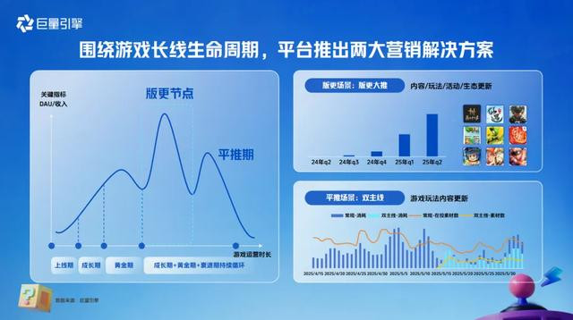 比如巨量引擎不止提供工具,还会提供定制化方案,针对性地支持厂商。在版更大推中,巨量引擎就会为厂商定制覆盖14天版更周期的预热、爆发方案。