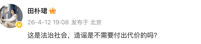 4月12日晚,田朴珺发文回应:这是法治社会,造谣是不需要付出代价的吗?