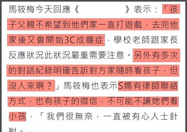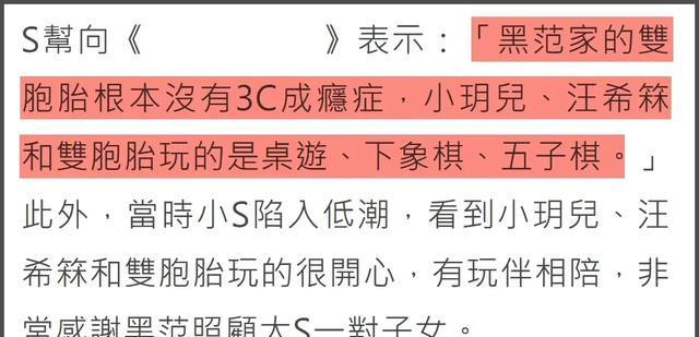 S家则是不支持的,所谓S帮出面反驳了马筱梅,声称大S子女去范玮琪家都是下棋、玩桌游,还提到小S看到大S子女和黑范家孩子一起玩,非常感谢他们照顾大S子女。