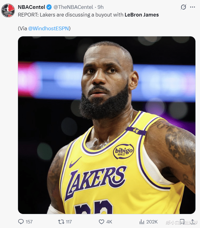 美媒NBA Centel调侃:湖人队正在与勒布朗-詹姆斯谈买断。(没错,只要湖人买断了詹姆斯,那么詹姆斯就可以恢复自由身,他可以任意加盟自己想去的球队)