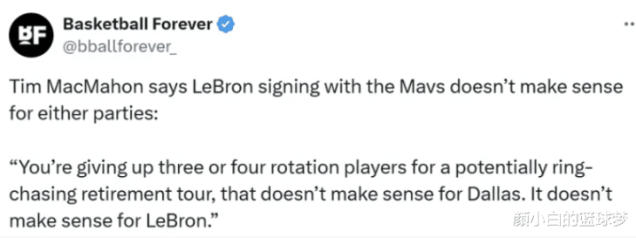此前独行侠是詹姆斯的第一下家,不过ESPN记者蒂姆-麦克马洪透露:“你们以为这是勒布朗为了争夺第五个总冠军,可对双方都没有意义,詹姆斯要换走独行侠3-4个轮换,夺冠概率下滑,独行侠也损失未来。”