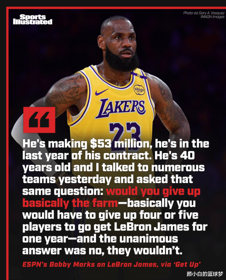 ESPN薪资结构专家鲍比-马克斯也表示:勒布朗年薪5300万处于合同最后一年,我跟很多球队谈过“你们愿意为了一个41岁的勒布朗进行交易吗?这可能要损失半只球队!”我得到的答案都是否定的,他们不会这么做。