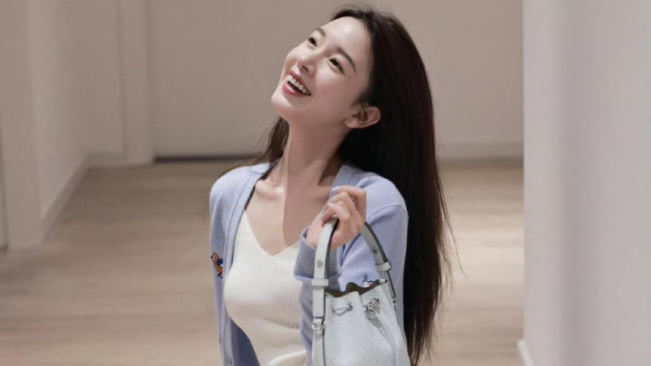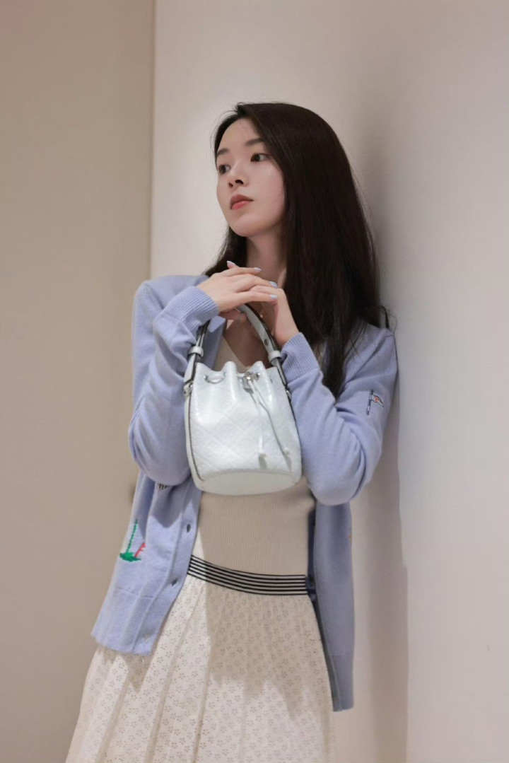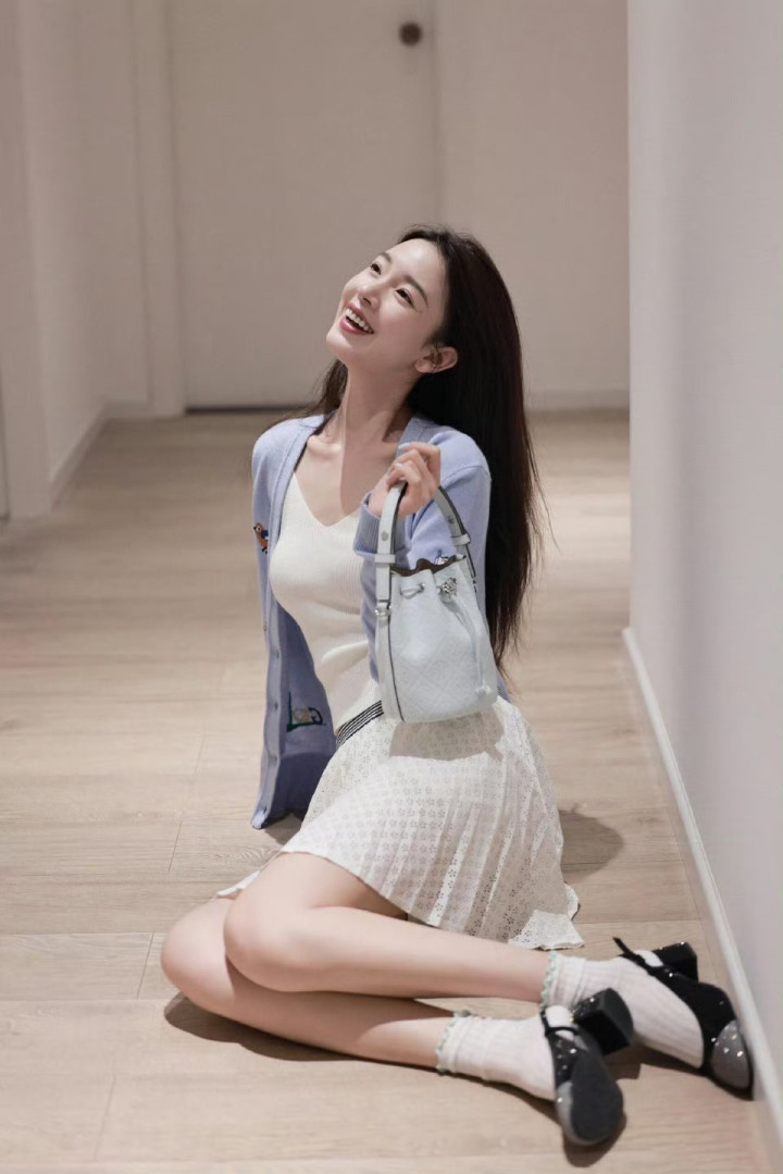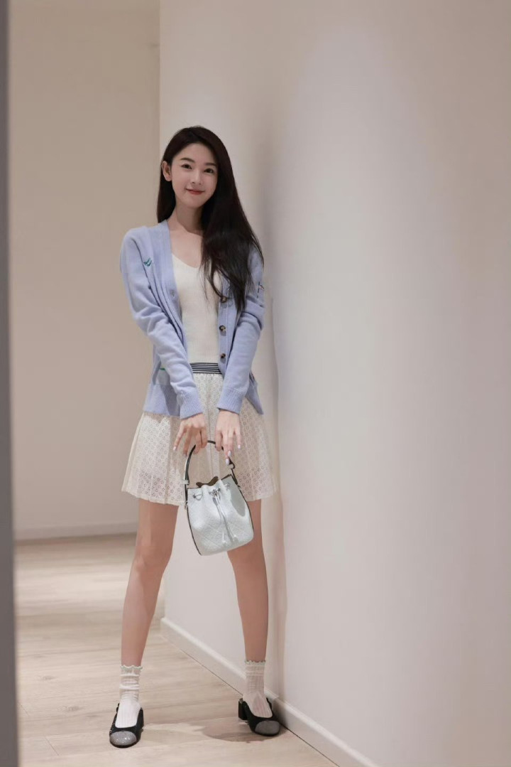 陈瑶腰臀比绝了,淡蓝开衫搭白裙,清新又显身材