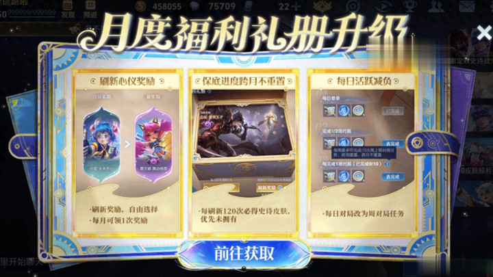 而这次的福利礼册变成了完成任务刷新皮肤,和最开始的回忆礼册一样,每次刷新都会刷出不同的奖励。