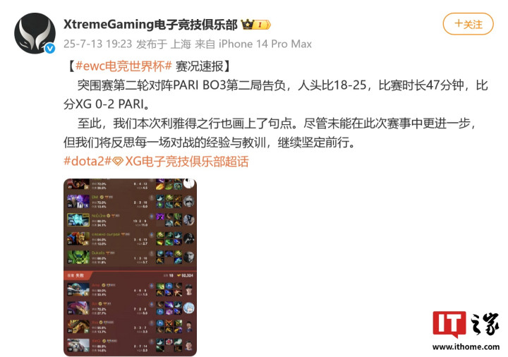 IT之家7月14日消息,电竞世界杯《DOTA2》项目的第二阶段晋级/突围赛已于北京时间今日结束。这一项目的唯一参赛中国战队XtremeGaming(XG)在昨日的BO3中以0:2的比分不敌对手PARIVISION被淘汰出局,止步9~12名。