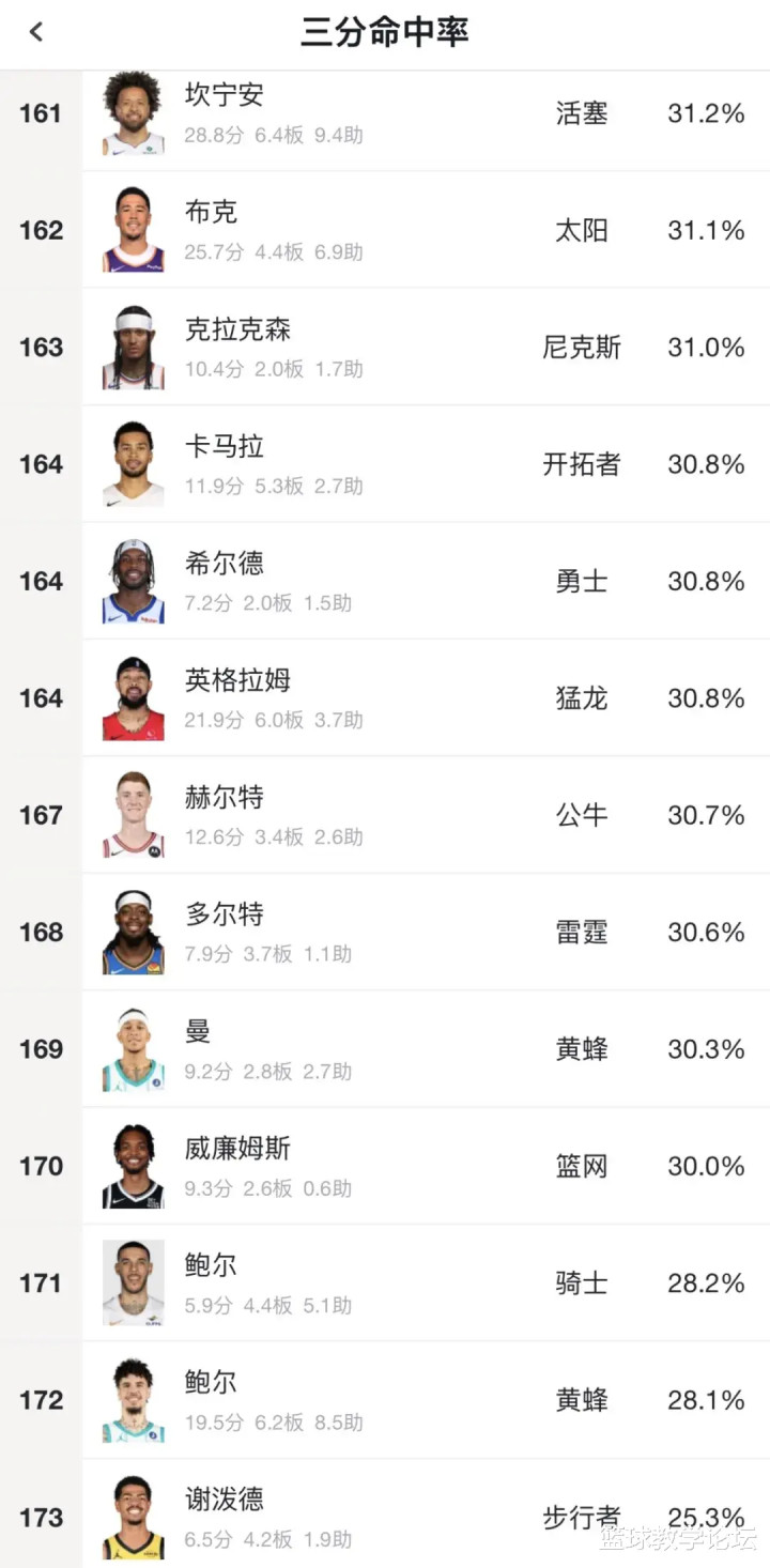 他场均三分出手数高居联盟第7,仅次于库里(12)、东契奇(10.9)、米切尔(10.6)、马克西(9.6)、马尔卡宁(9.1)。但是三球的三分命中率只排联盟第172位!大家猜猜三分命中率第171位是谁?正是他的亲大哥:球哥!